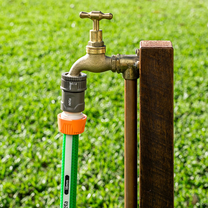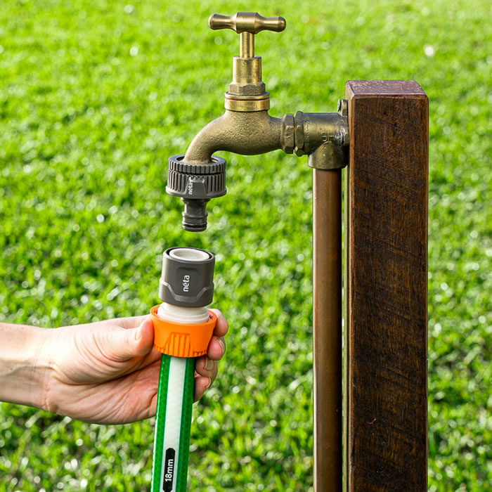 Designed for use with 18mm garden hoses to convert and connect to 12mm hose-end accessories. Ideal for larger hose sizes.